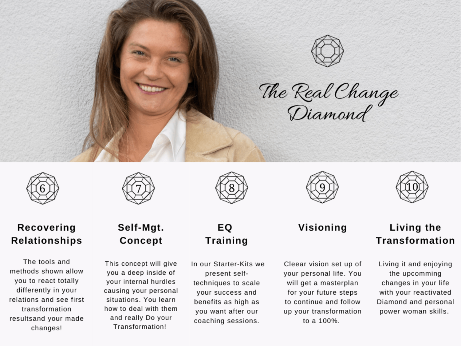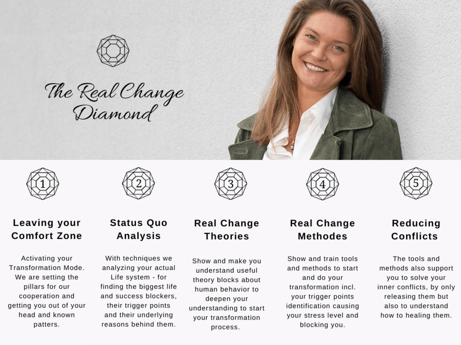 - Your Real Mindset Change (Tools & Methods): We show, teach and train you the tools and methods which you need to know, to start and do your transformation. With the identification of your trigger points we eliminate your stress level to start your real transformation process.