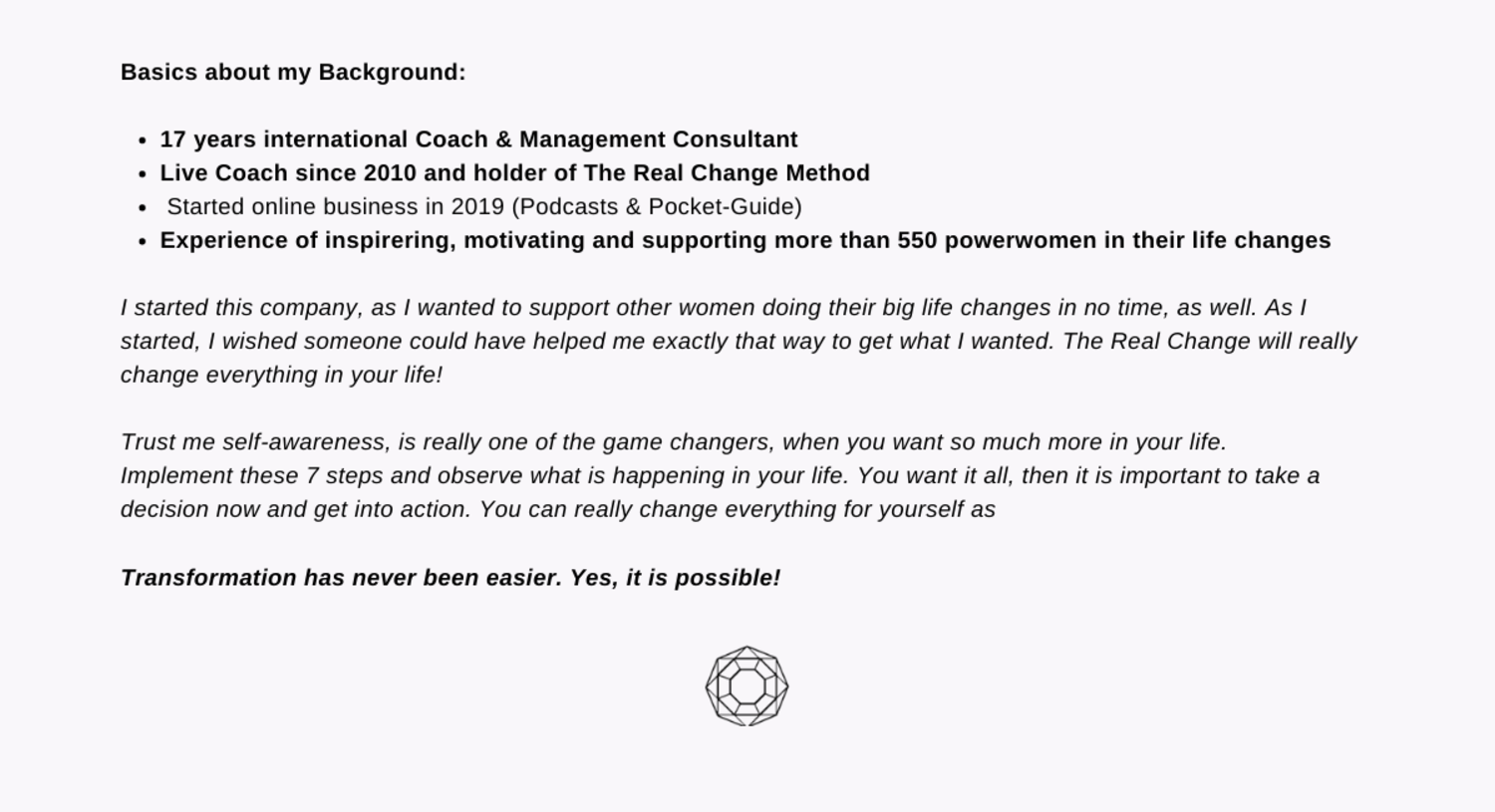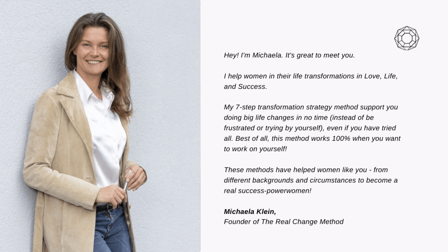 Learn the step-by-step Masterplan how to Boost your Life - do The Real Change - your Transformation - in Love, Life and Success. With the right tools, methodes and techniques, you can do that, as well. Get now in contact with me and let`s talk about your situation and your future. There is no better time to invest in yourself!