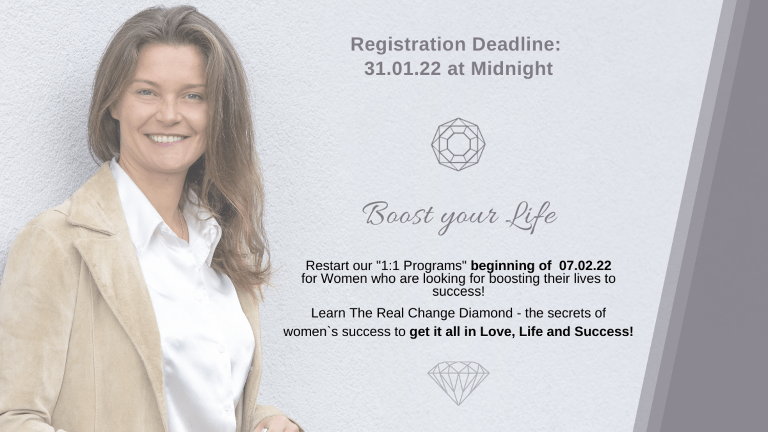 Upcomming now in FEB 2022:Learn the step-by-step Masterplan how to Boost your Life - do The Real Change - your Transformation - in Love, Life and Success. With the right tools, methodes and techniques, you can do that, as well. The next "Boost Your Life" 1: 1 Program start on the 07.02.2022 with a small fraction of women. Are you joining us with: